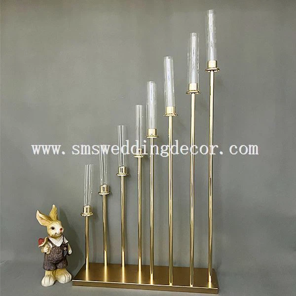 8 עמודי המנורה של מחזיק מנורת זה מסודרים בקו מנמוך לגבוה על לוחית בסיס מתכת מוזהבת. מידות הבסיס הזה הן 20 ס"מ רוחב על 69 ס"מ אורך. גובה העמוד הגבוה ביותר כולל האהיל 128 ס"מ. חתונת מנורות זהב זו זמינה עם גוון אקרילי או גוון זכוכית.